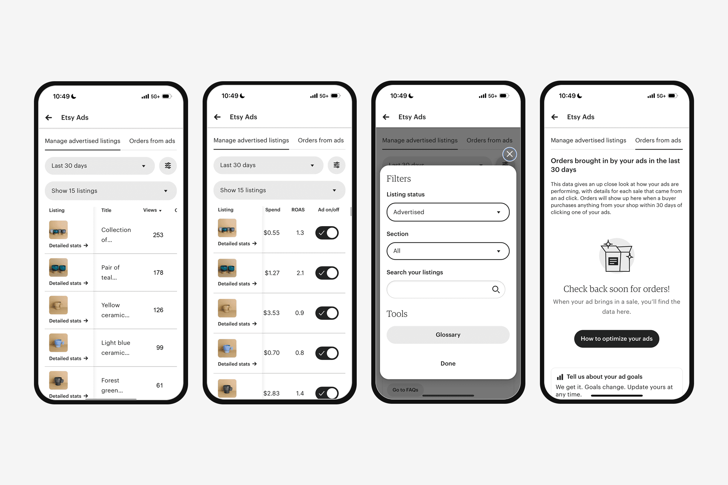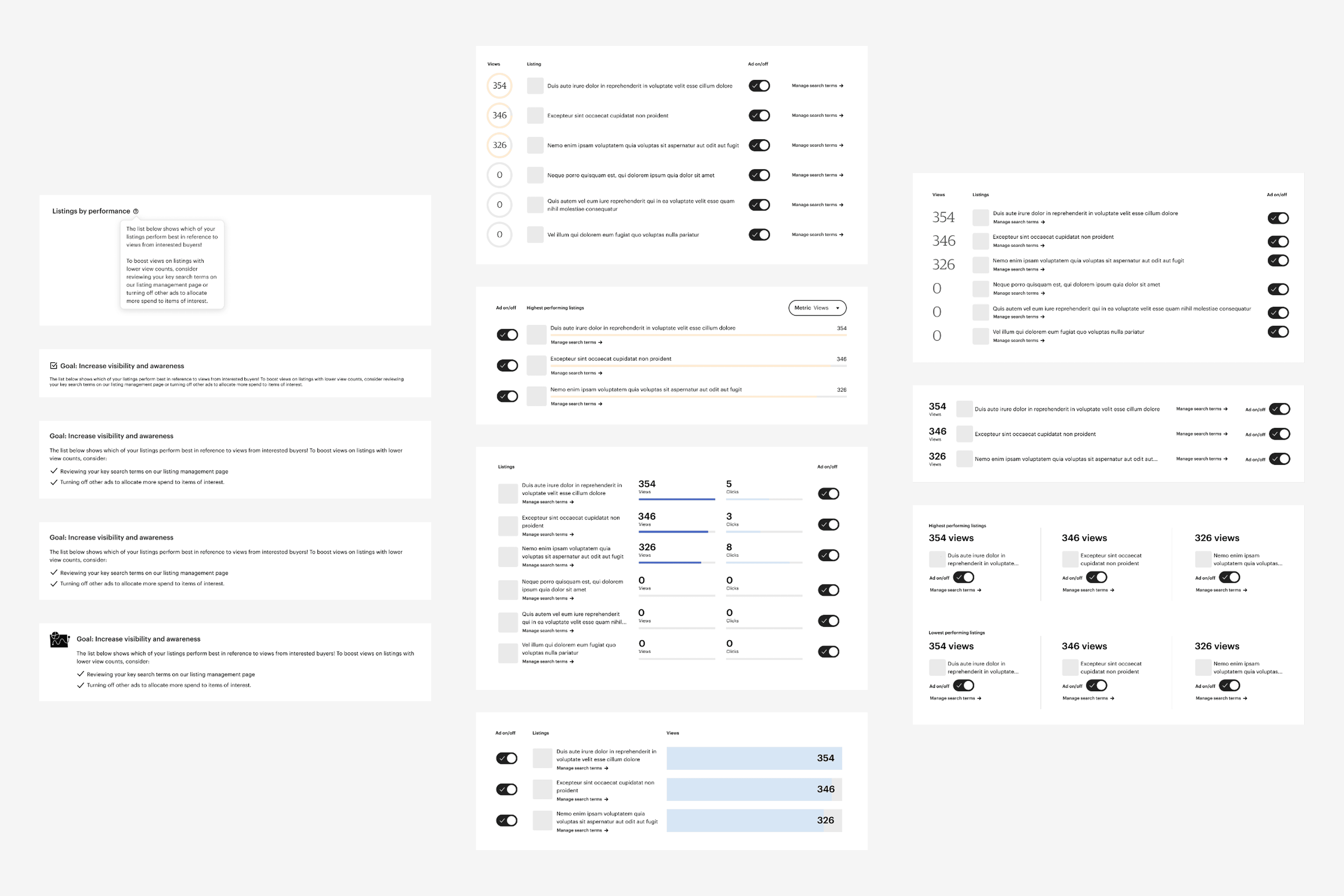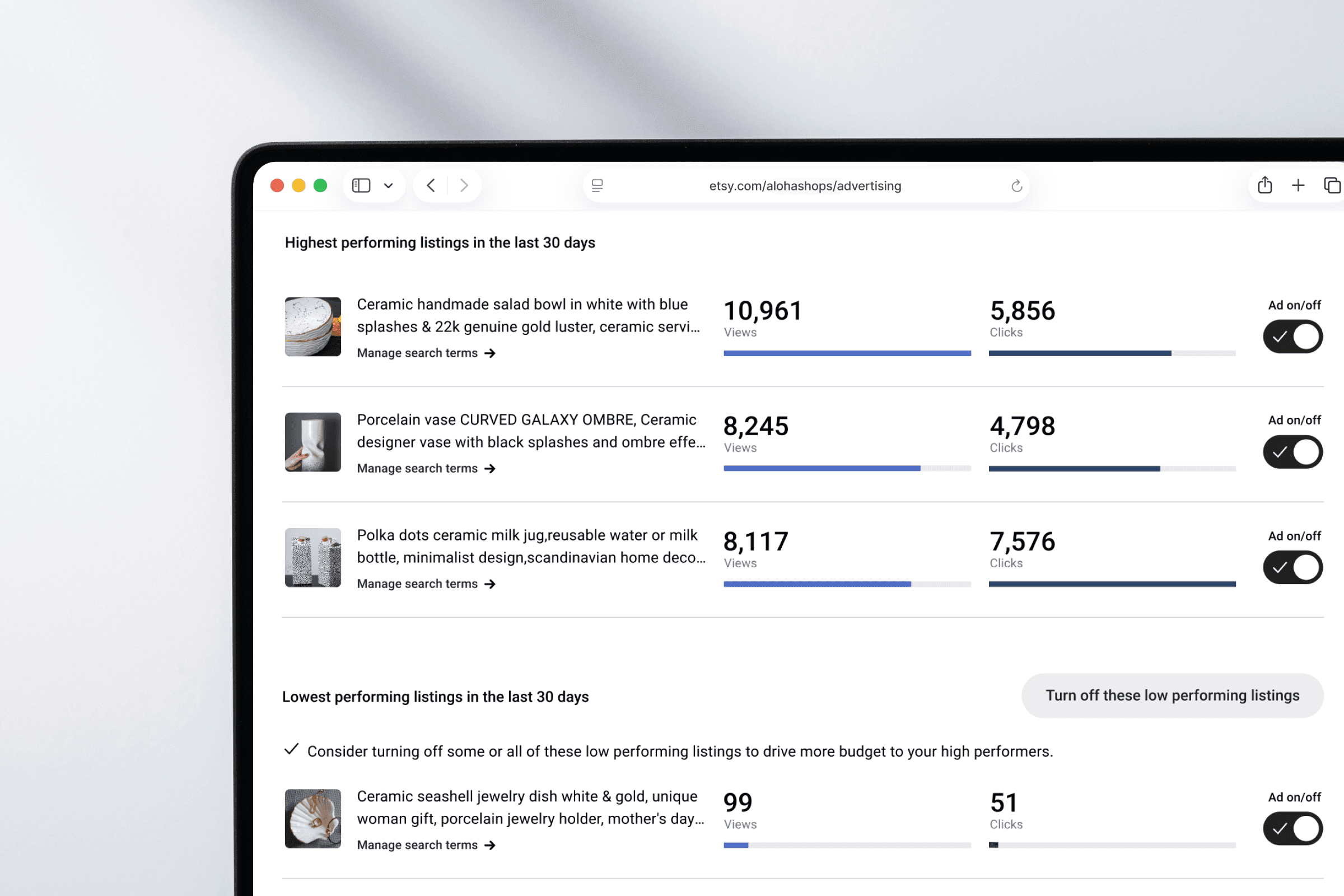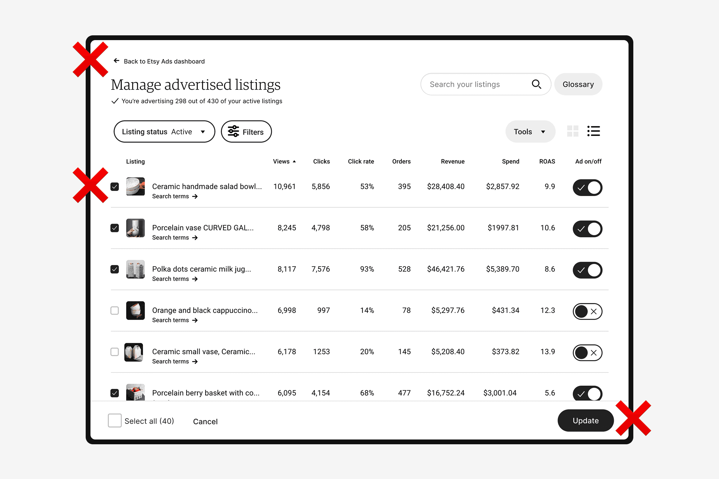 Sellers needed a faster way to intuit performance and action. I explored visual approaches to surface what mattered: groups by performance with a one-click option to turn off ads for low performers.