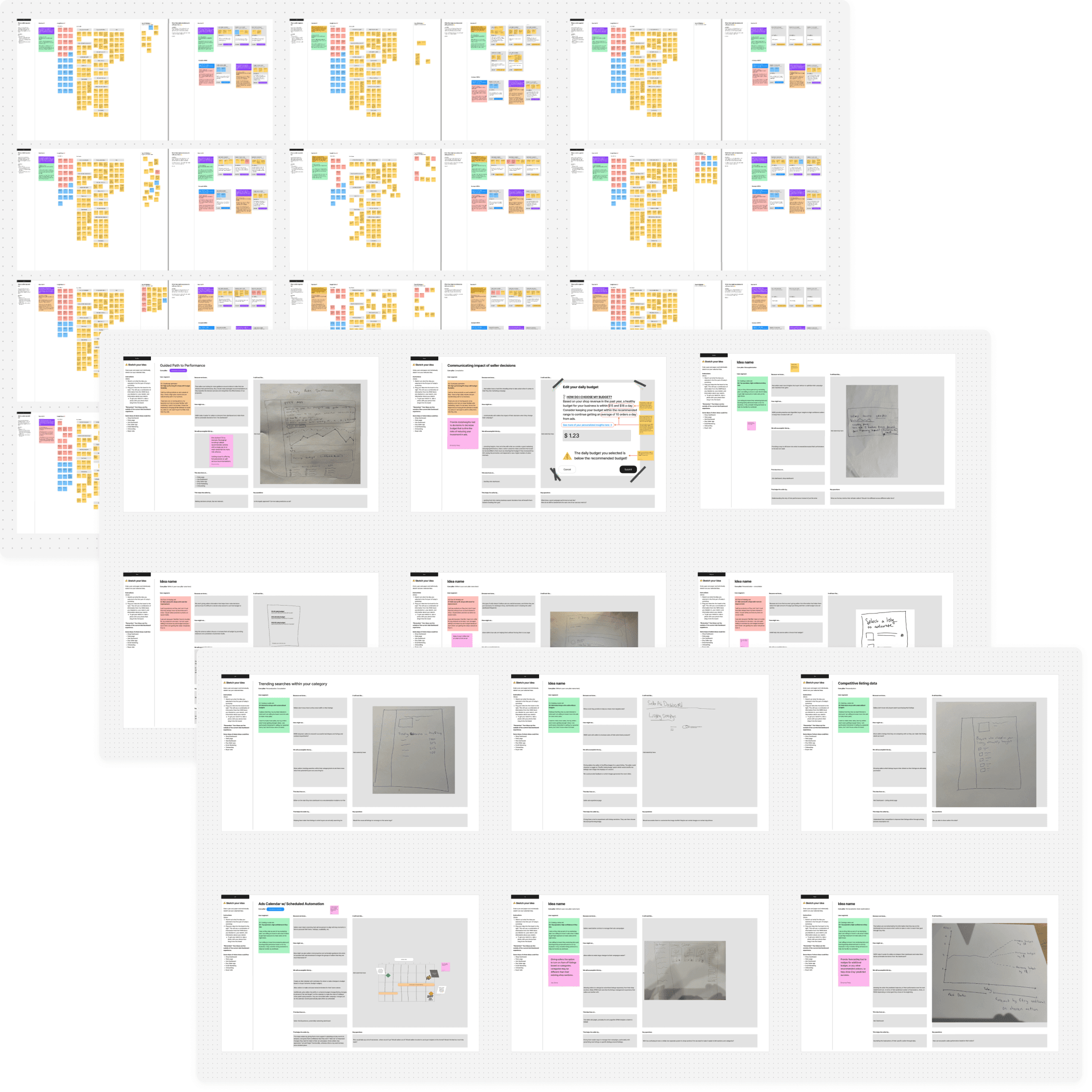 To quickly generate a wide range of concepts, I planned a 4-day sprint with key Ads stakeholders. I led with an audit of the Etsy Ads experience to inform our direction. The sprint yielded nearly 50 ideas, which we worked with leads to prioritize down to 14.