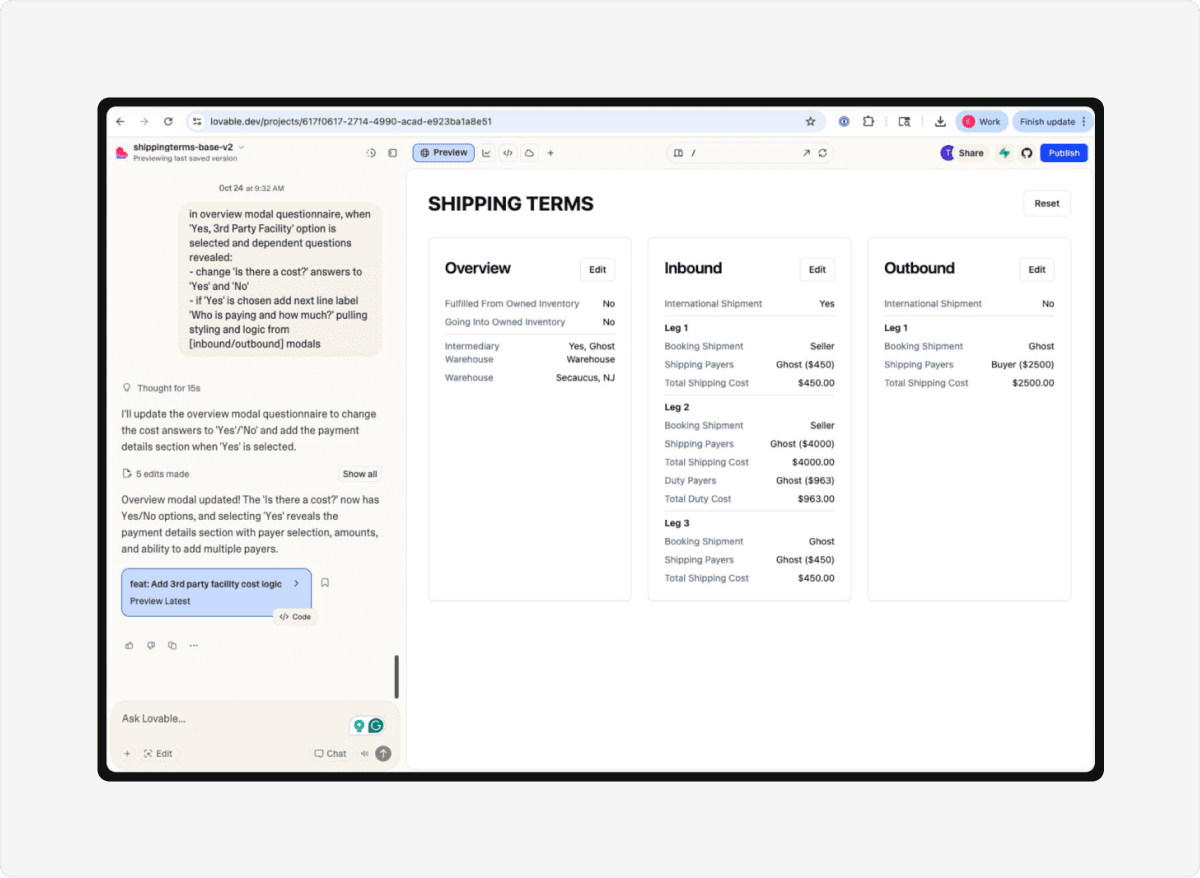 Using AI tools I built interactive prototypes to rapidly validate complex shipping logic with internal stakeholders.