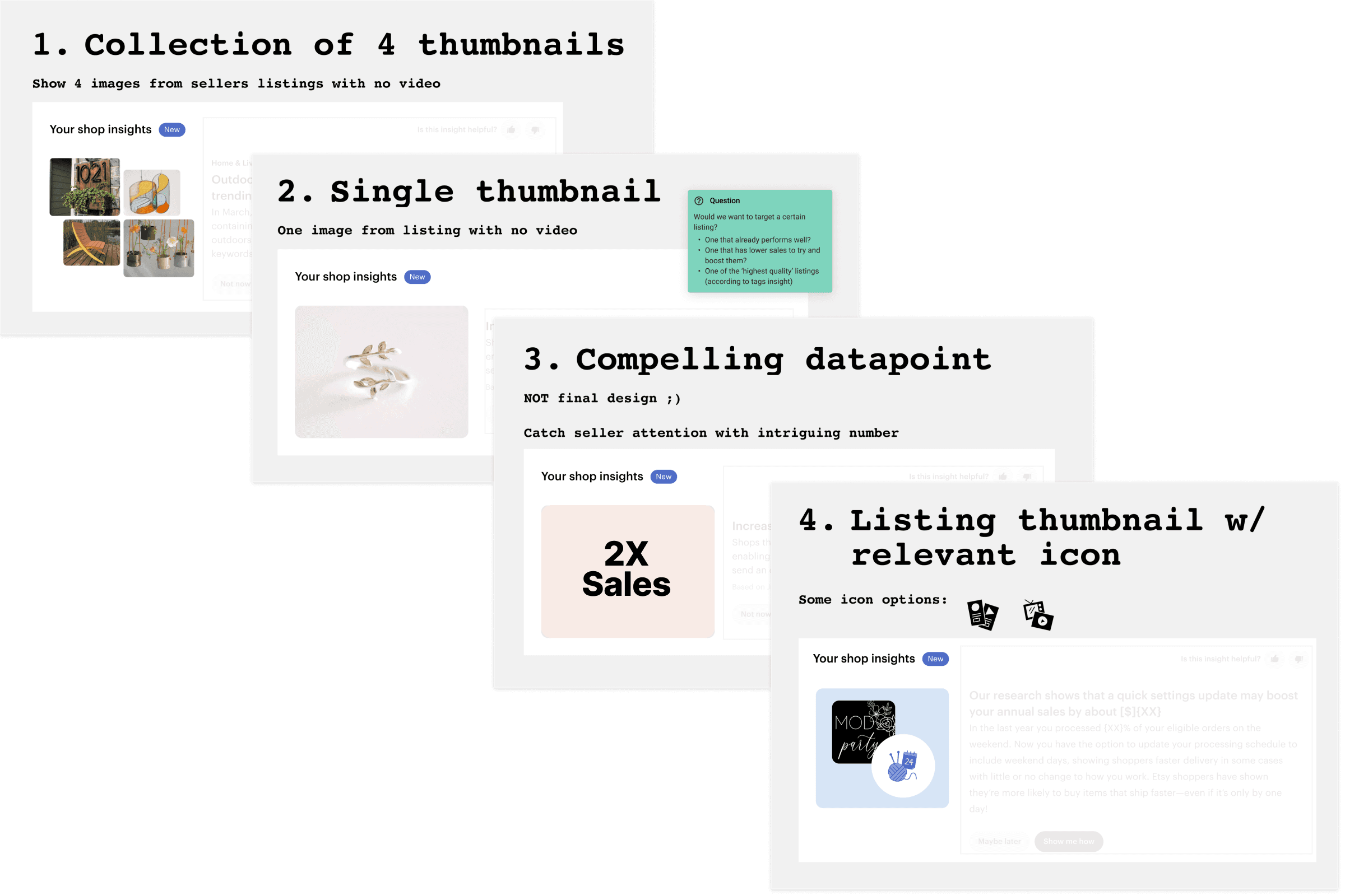 I explored thumbnail options and worked with my analyst on dynamic messaging. Category-specific competitive data was tailored to each seller, highlighting their high-performing listings without video.