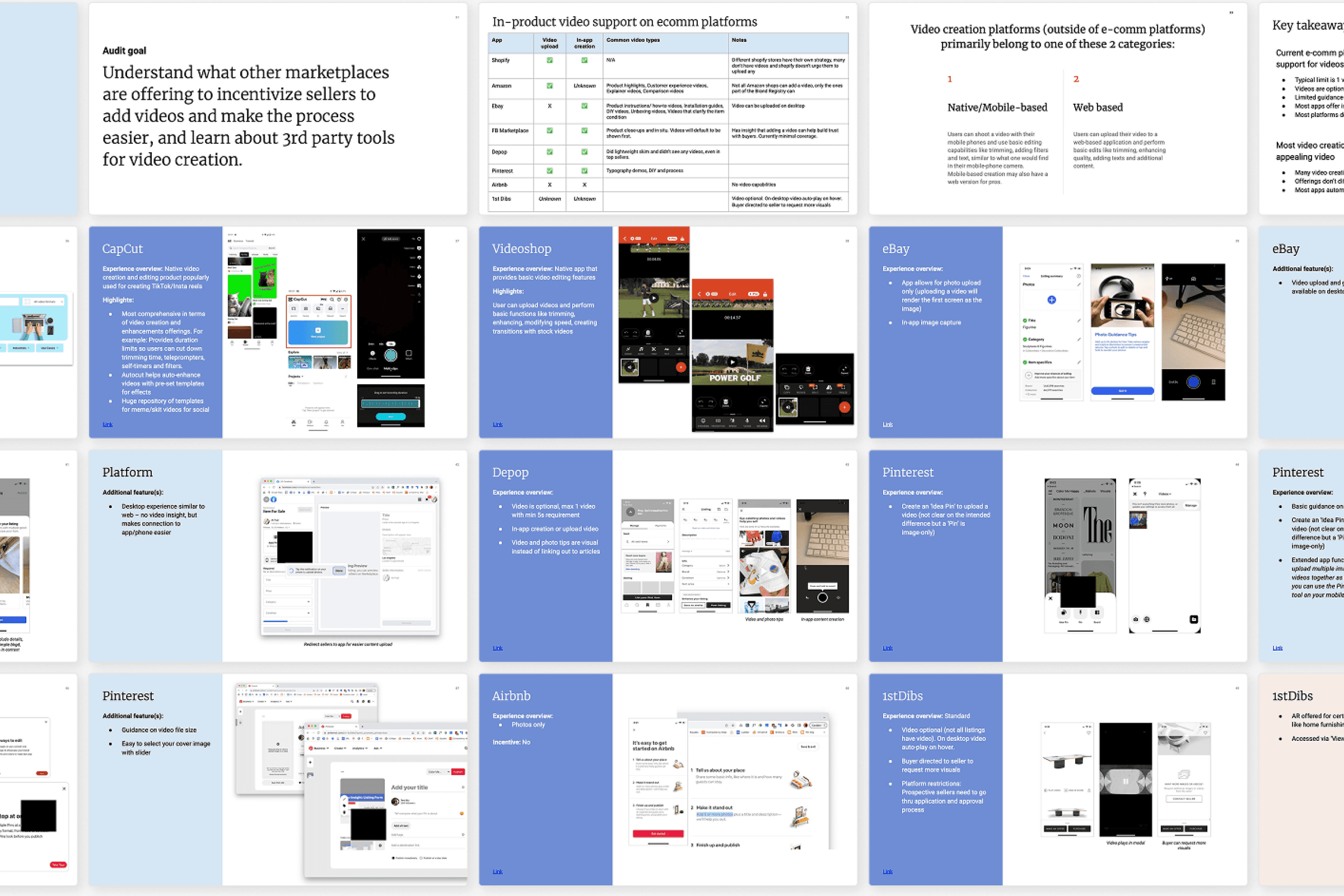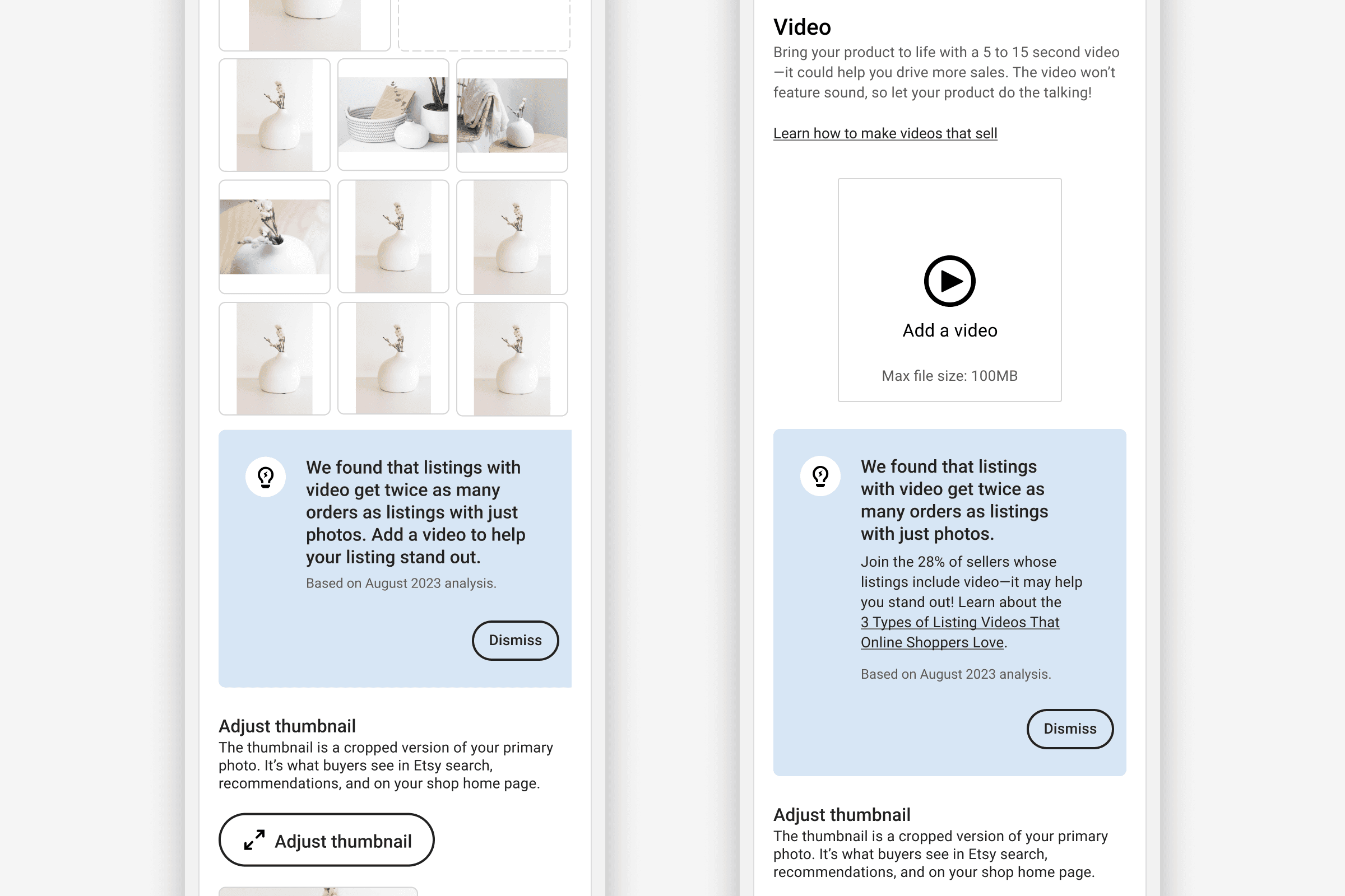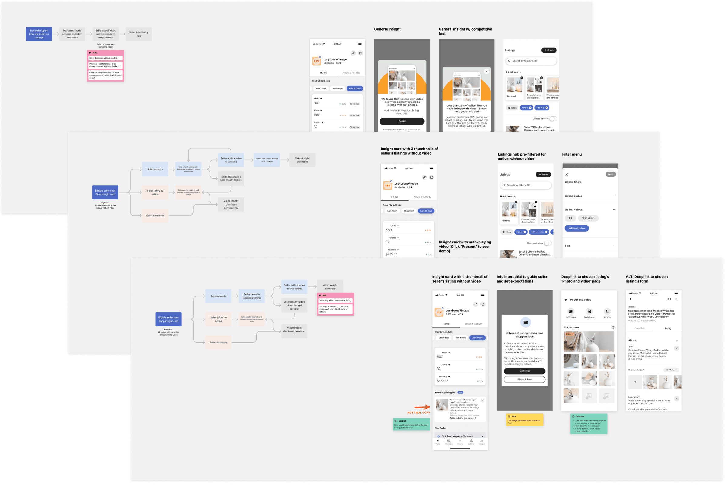 As Design Lead: I owned the strategy for driving video adoption across Etsy's seller platform. I designed three multivariate experiments across partner team surfaces while facilitating a 24-person discovery workshop to shape the long-term roadmap.