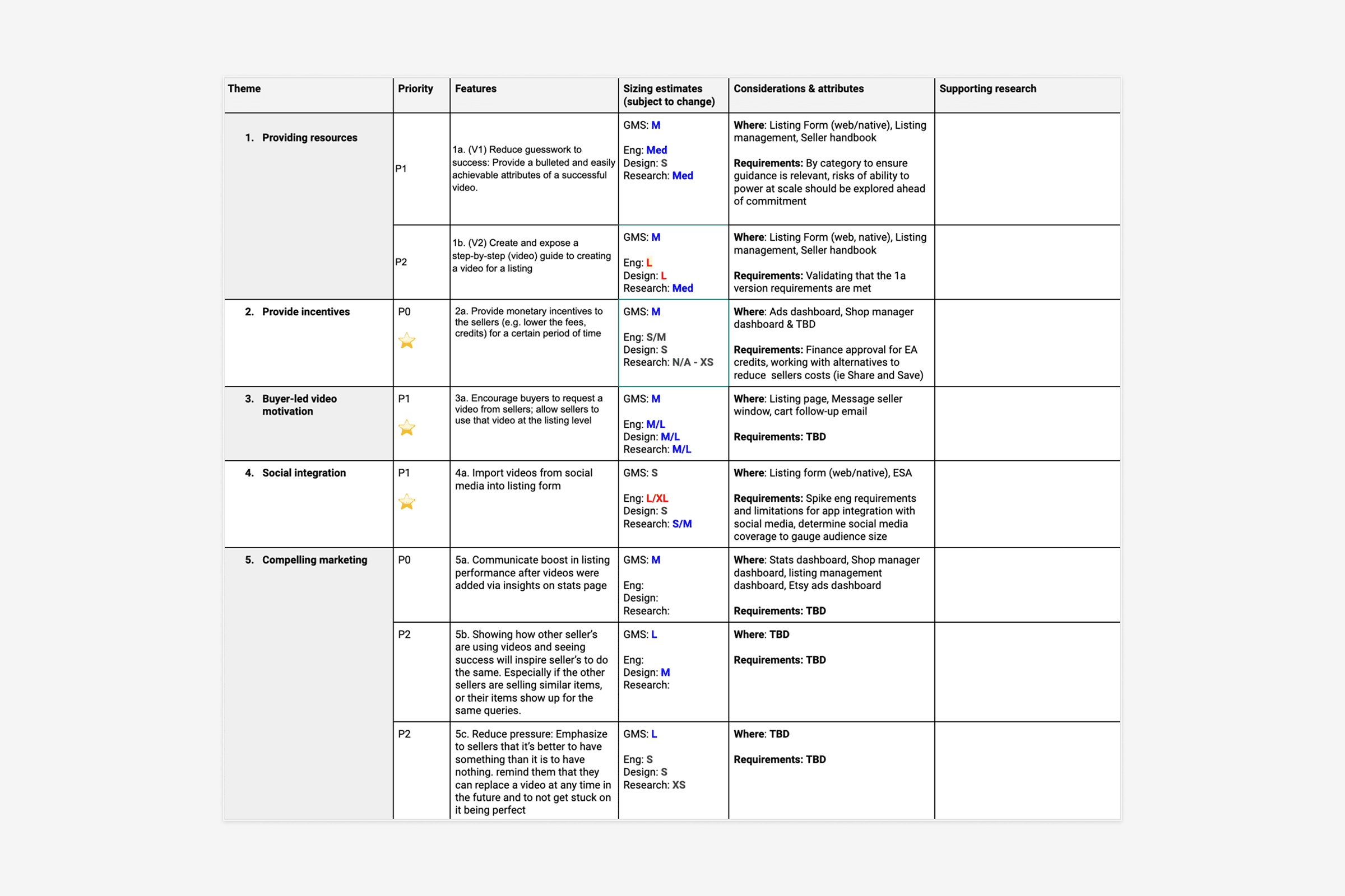The workshop generated ~40 feature ideas. Team leads and I prioritized these into five themes and eight features.